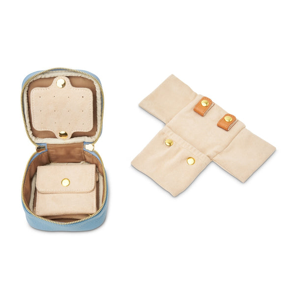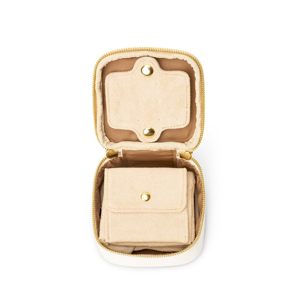 Introducing the Isabella Jewelry Case: an exquisite leather jewelry case that is secure and smartly designed for the fashionista on the go. The lid features a ring strap as well as an earring strap that holds up to six pairs of earrings. The main body features one attached and one removable storage pouch with zippered compartments are perfect for earrings, rings, bracelets, and necklaces. A bottom section opens to reveal six necklace organizer loops with snap closures, with a microfiber-lined overlay to keep them protected and untangled.