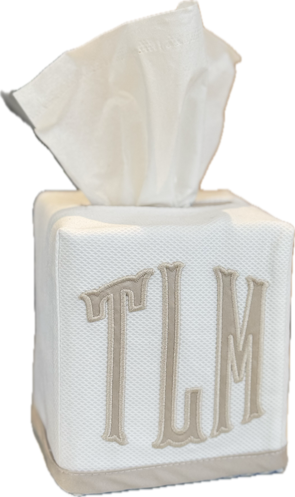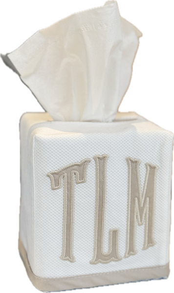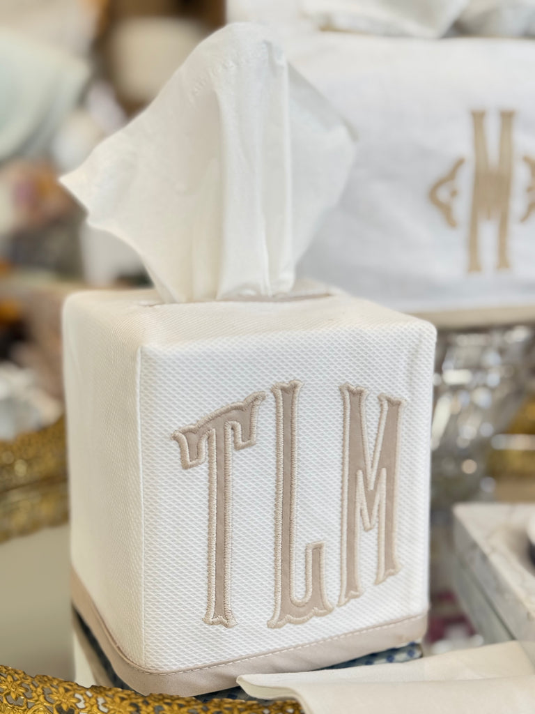 Our elegant handmade Pique tissue box cover, adorned with a personal monogram. Available in 9 different sateen accent options, to match any setting. Fits a square tissue box style.