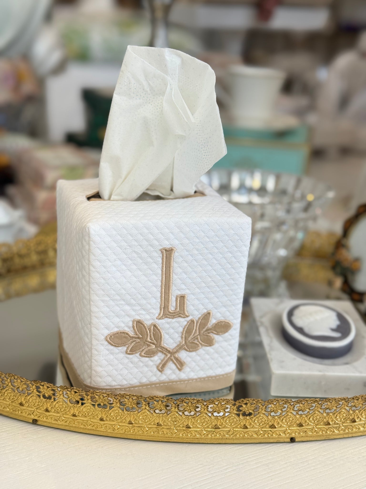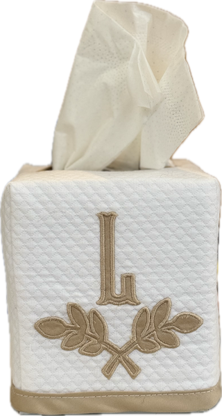 Our elegant handmade Pique tissue box cover, adorned with a personal monogram. Available in 9 different sateen accent options, to match any setting. Fits a square tissue box style.