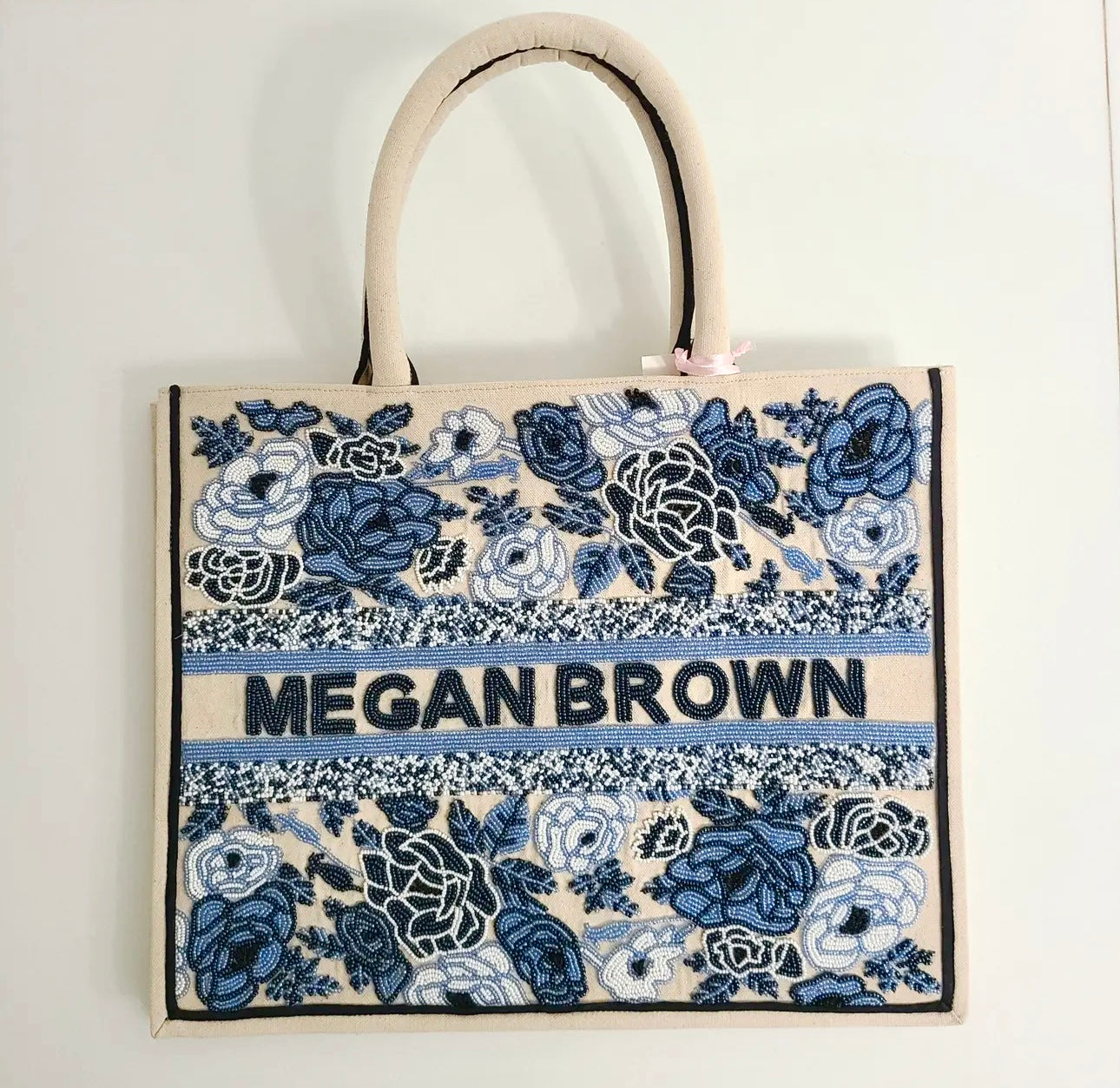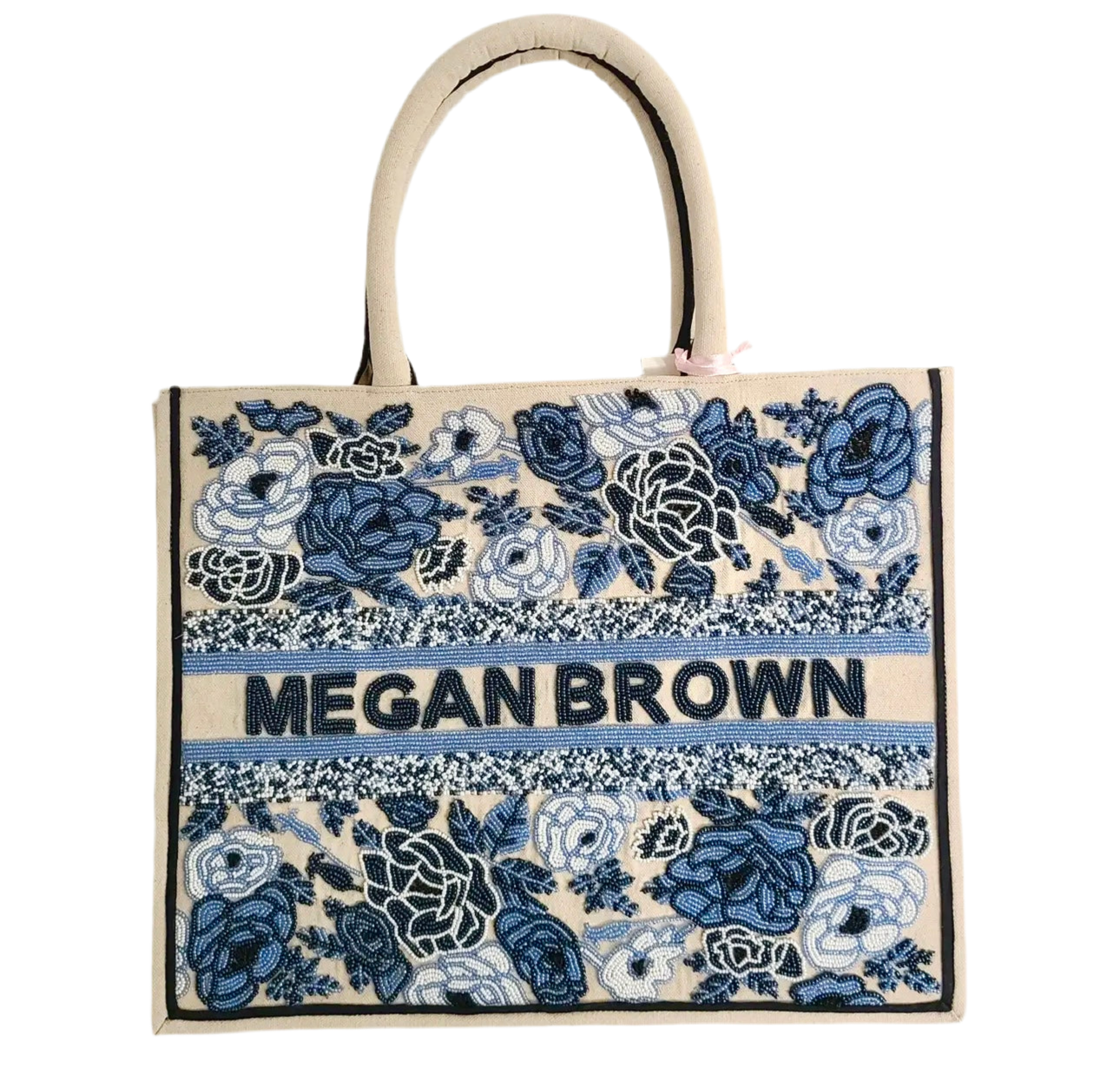 Our handmade beaded bags are the prettiest way to tote your things. Available with cloth or bamboo handles and adorned with a name or initials of your choice between the borders, as shown in product photo. If you would like to customize the bead color for the name or initials, please let us know your preferred color in the additional notes section.