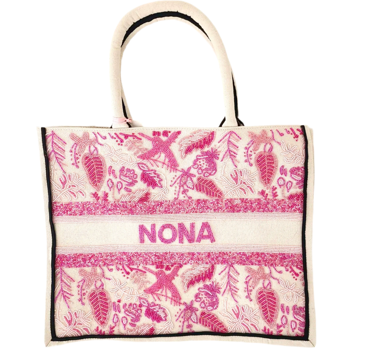 Our handmade beaded bags are the prettiest way to tote your things. Available with cloth or bamboo handles and adorned with a name or initials of your choice between the borders, as shown in product photo. If you would like to customize the bead color for the name or initials, please let us know your preferred color in the additional notes section.