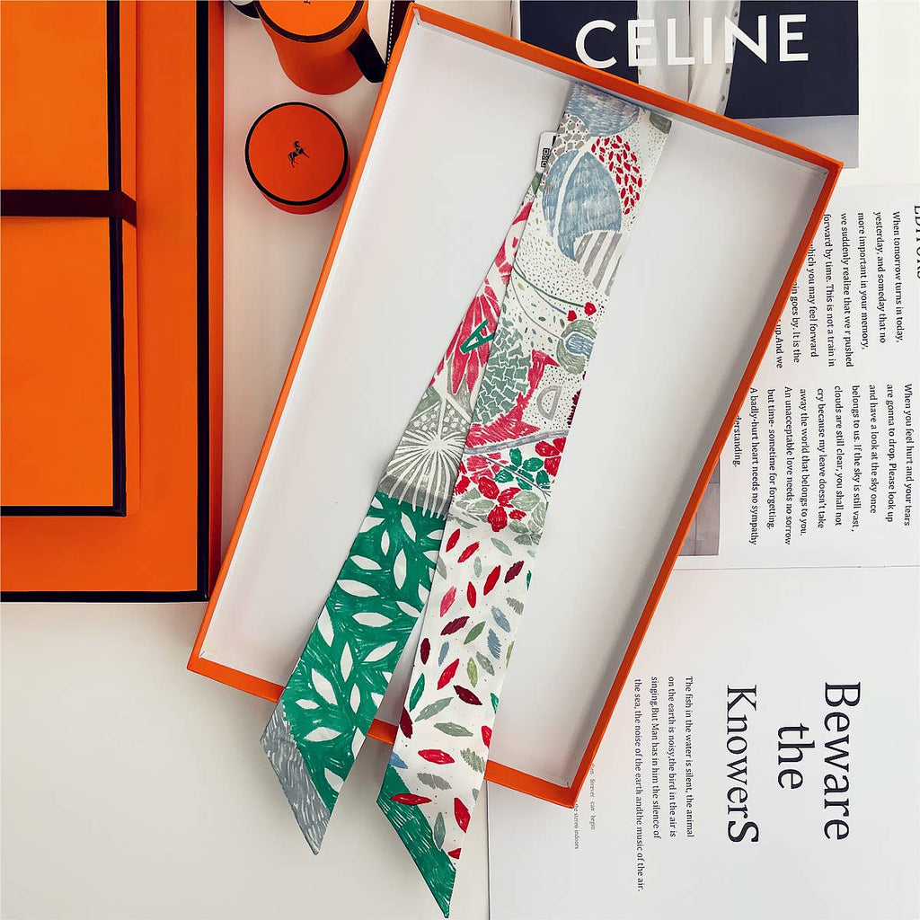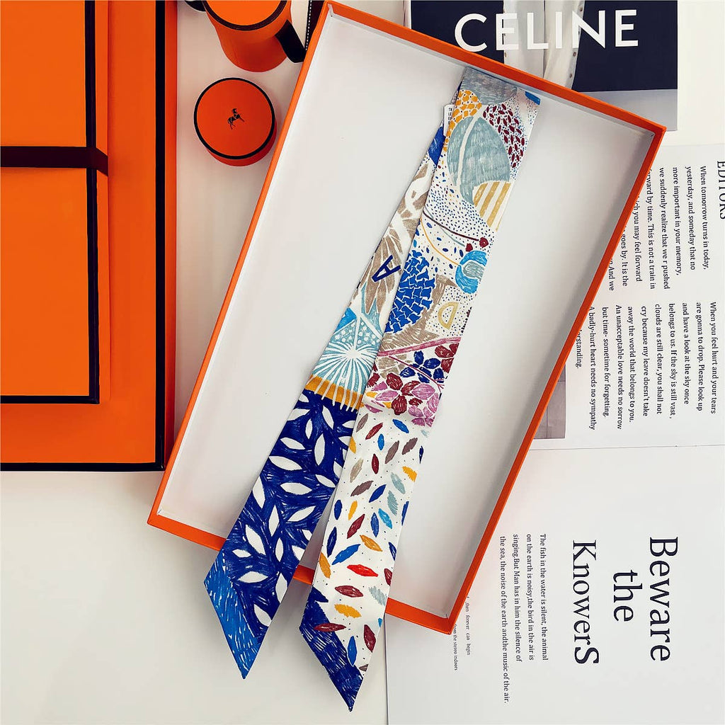 These beautiful items can be used as ties, scarves, hair scarves, wrist bracelets. Some have a complimentary reverse side. They come with a little round orange box.